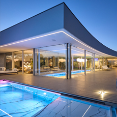 Na powierzchni 1500 m2 rozciąga się minimalistyczna bryła z białego tynku i kamienia, skrywająca w swym wnętrzu sypialnie, salon z kuchnią, strefę rekreacyjną, a nawet dwa baseny i lądowiska dla helikopterów.